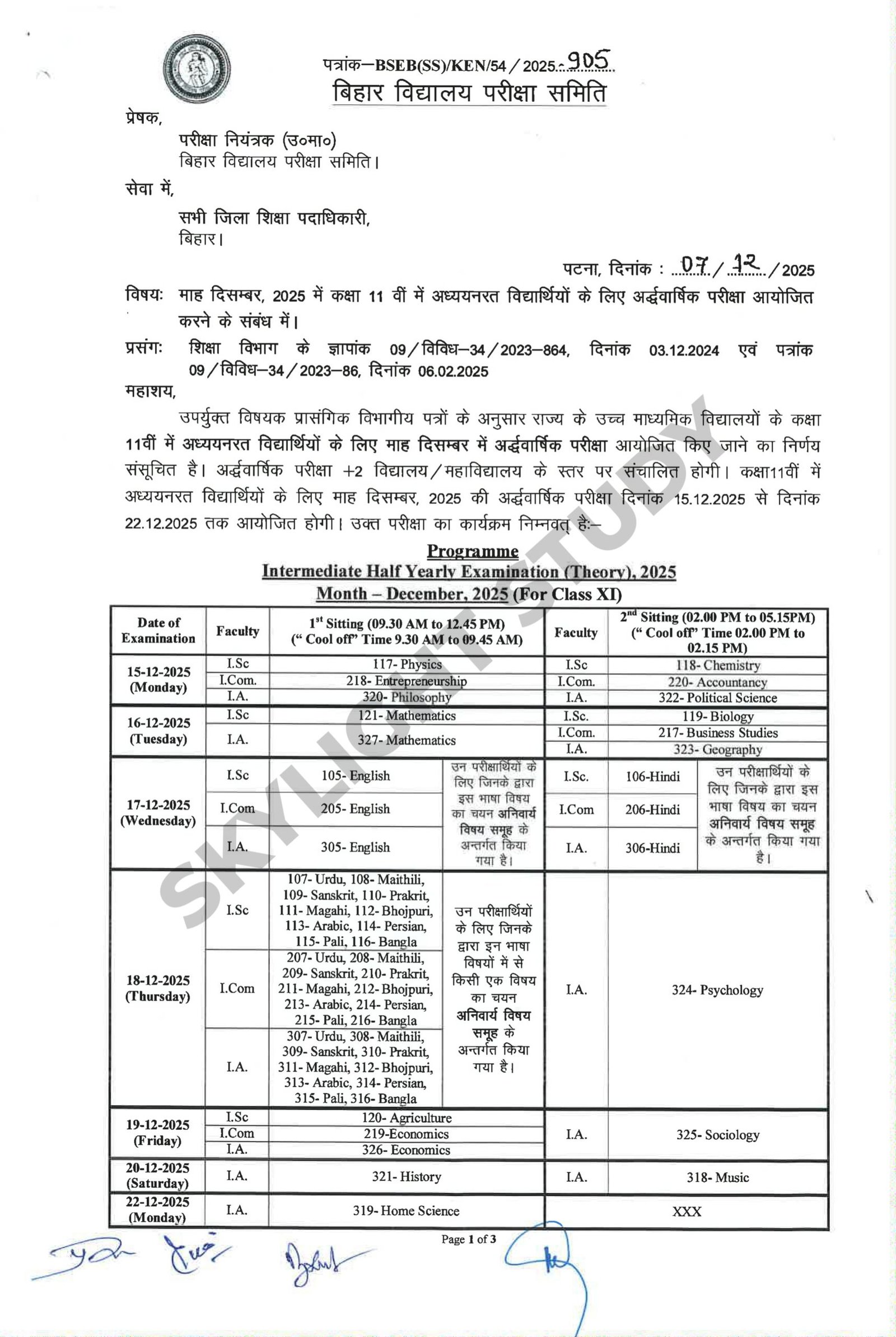 11th अर्धवार्षिक परीक्षा 2025 रूटीन डाउनलोड